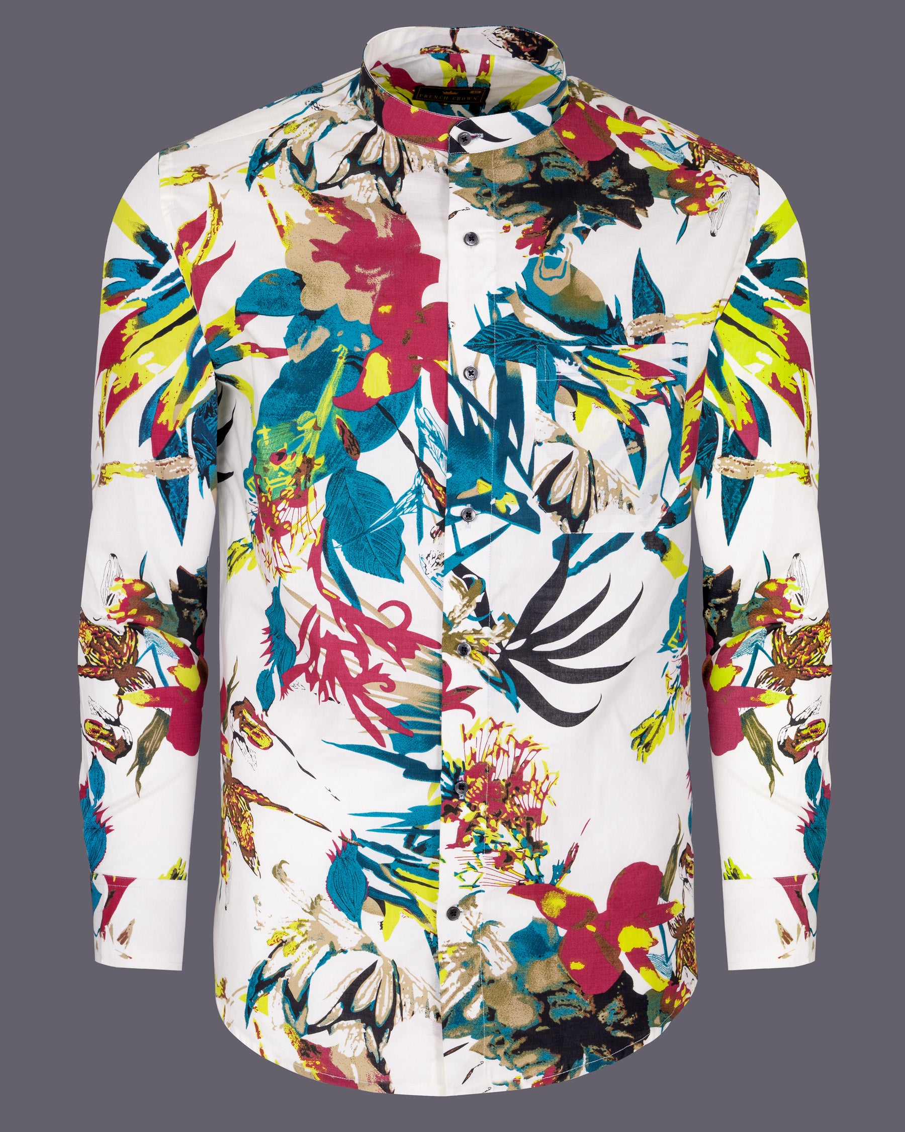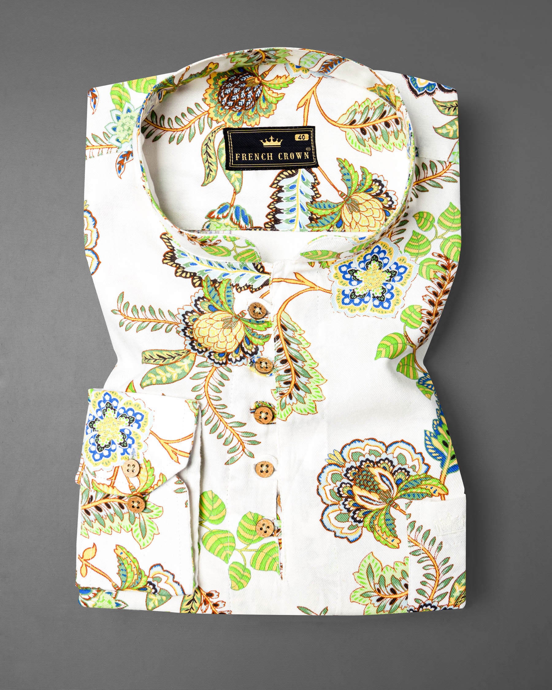 Off White Vibrant Flora art Printed Luxurious Linen Shirt