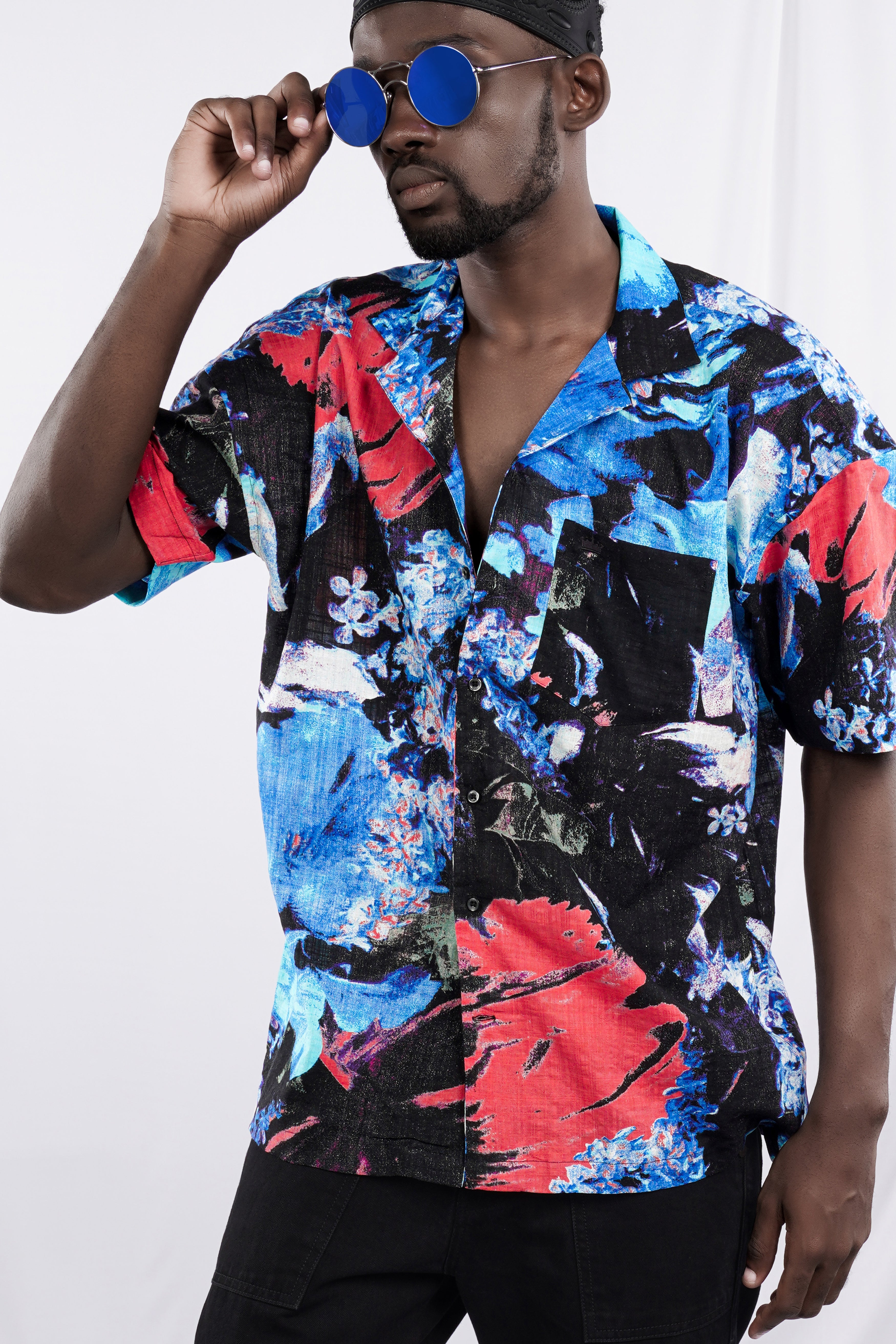 Brandeis Blue and Black Funky Printed Lightweight Oversized Premium Cotton ShirtBrandeis Blue and Black Funky Printed Lightweight Oversized Premium Cotton Shirt