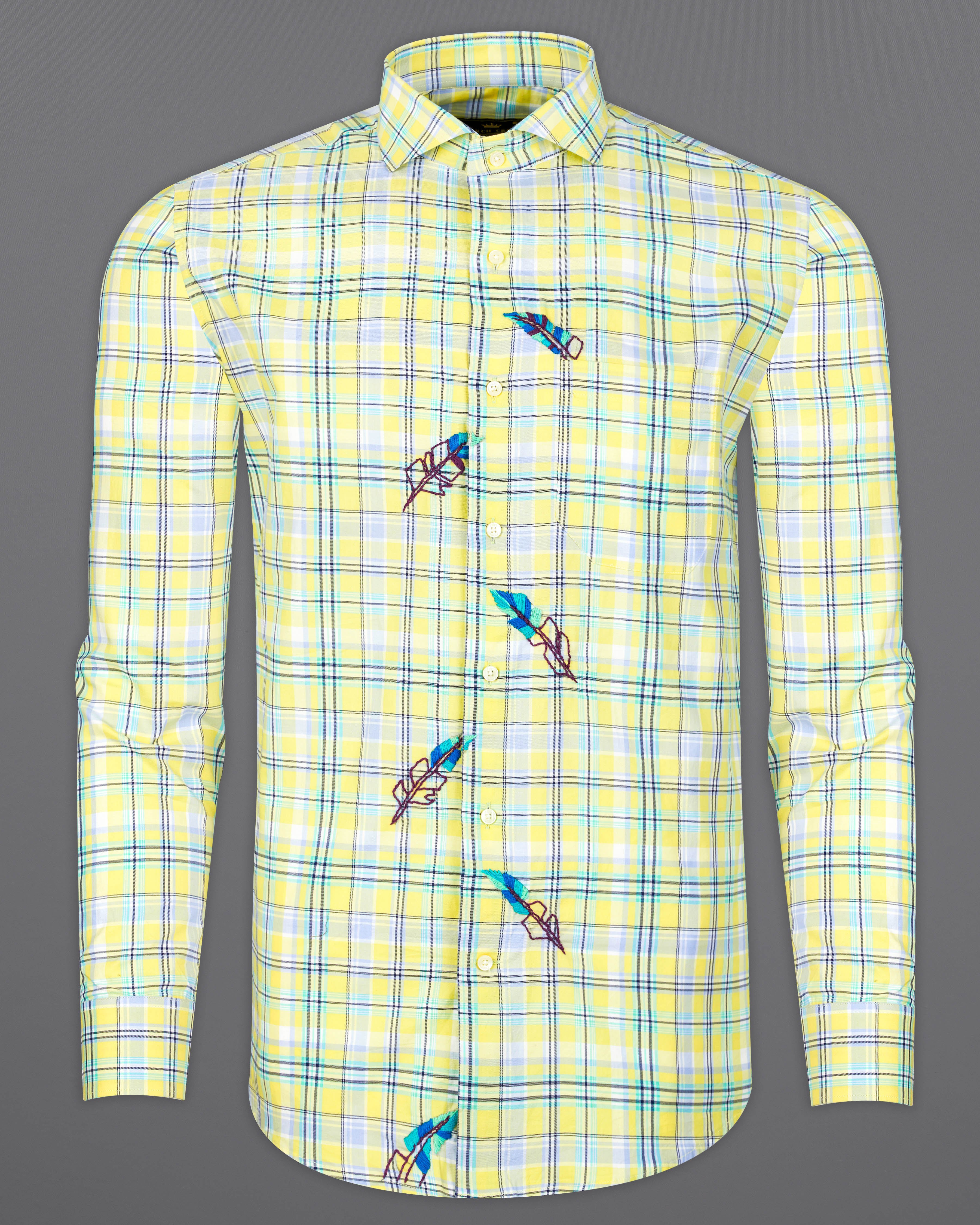 Manilla Yellow Checked with Leaves Embroidered Twill Premium Cotton Designer Shirt
