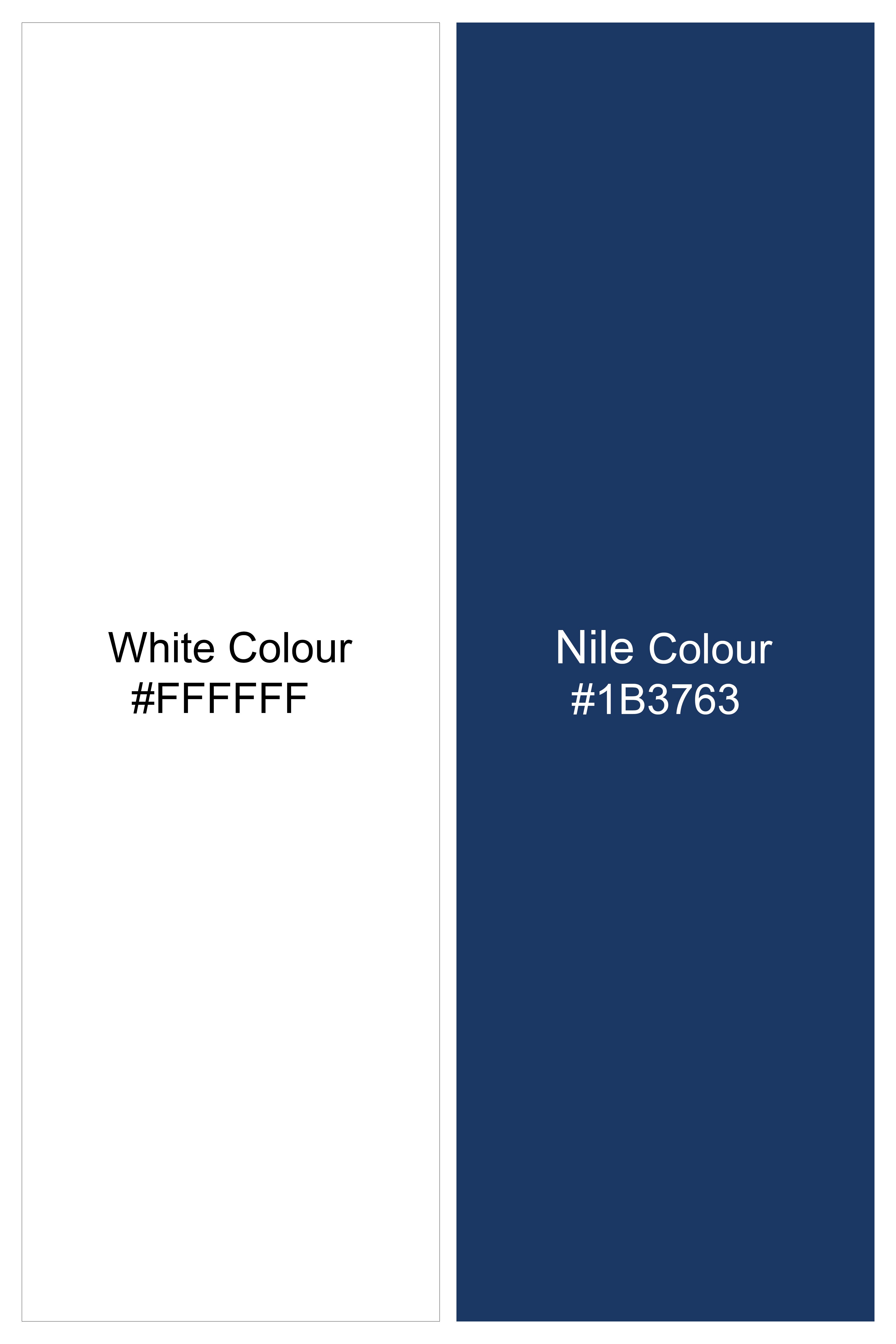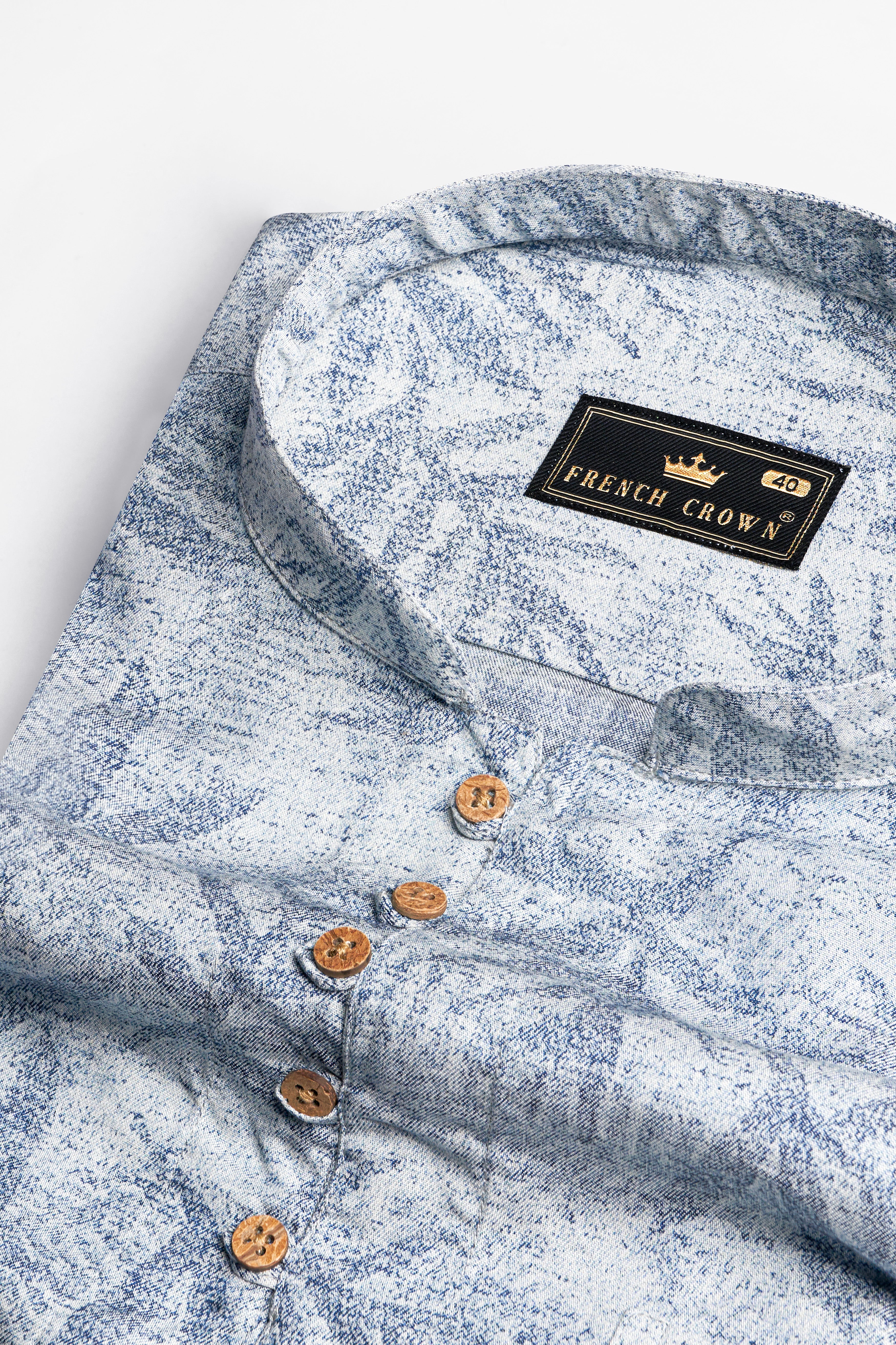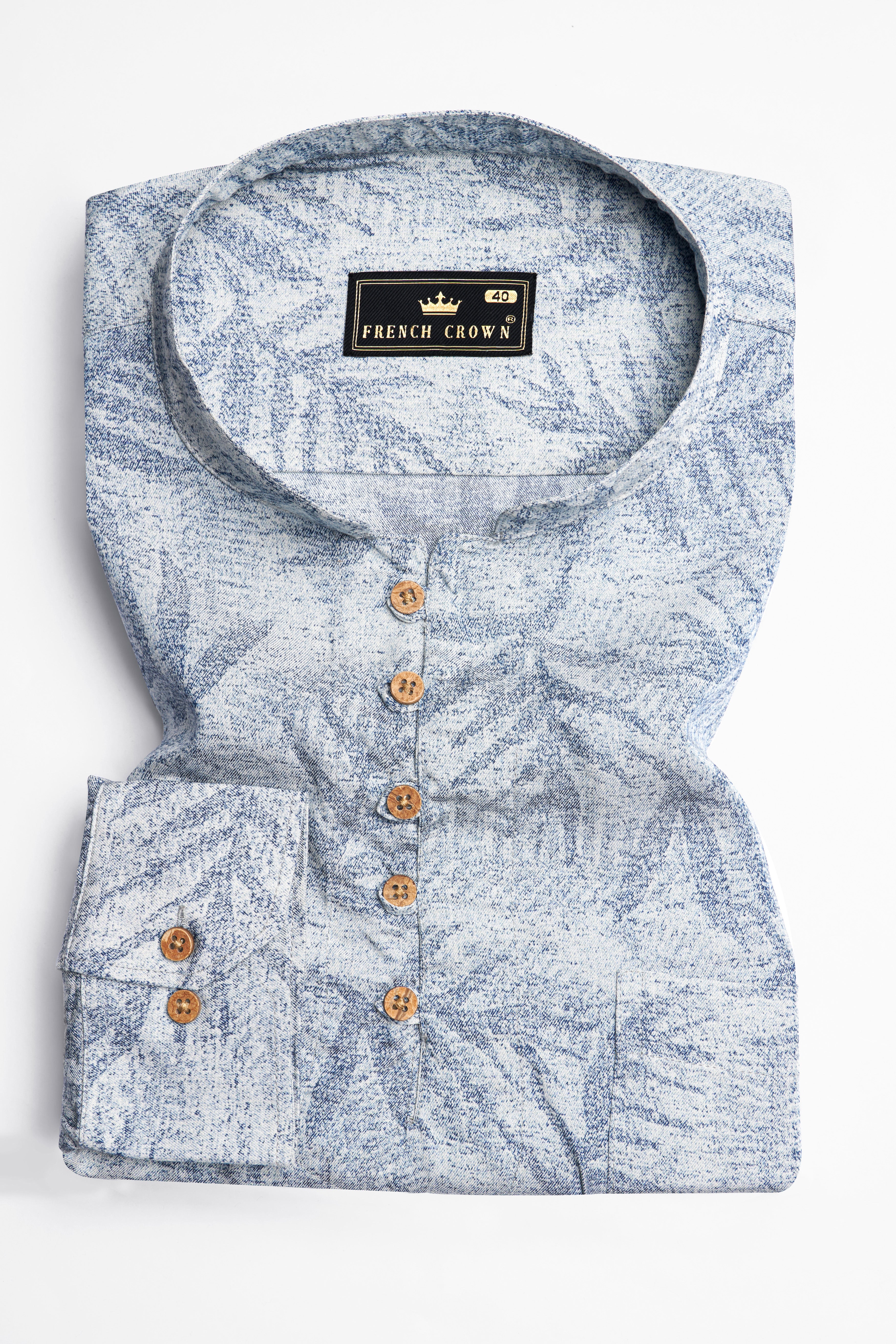 Bright White and Nile Blue Leaves Printed Premium Cotton Kurta Shirt