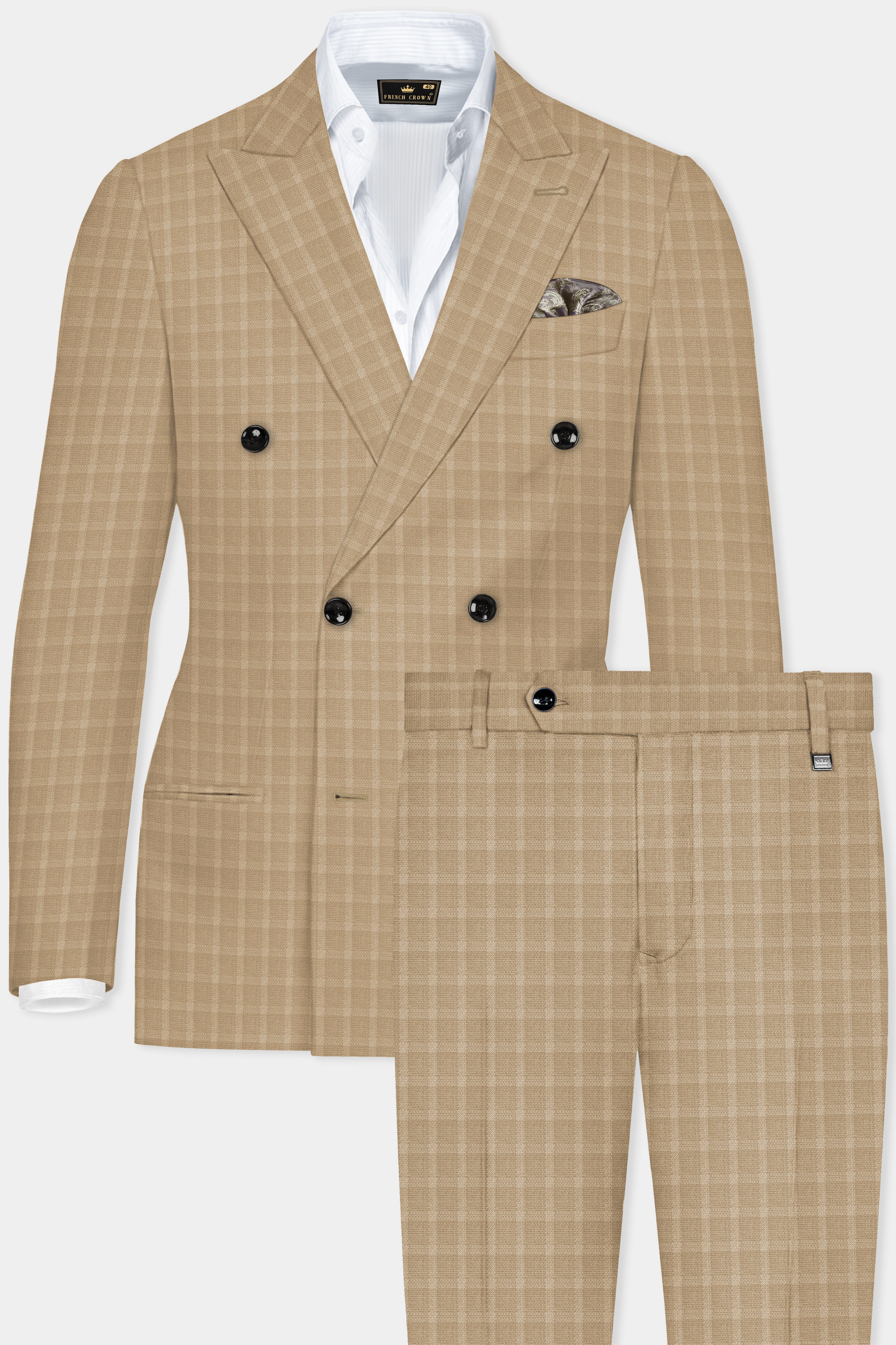 Stone Brown Plaid Wool Rich Double Breasted Suit