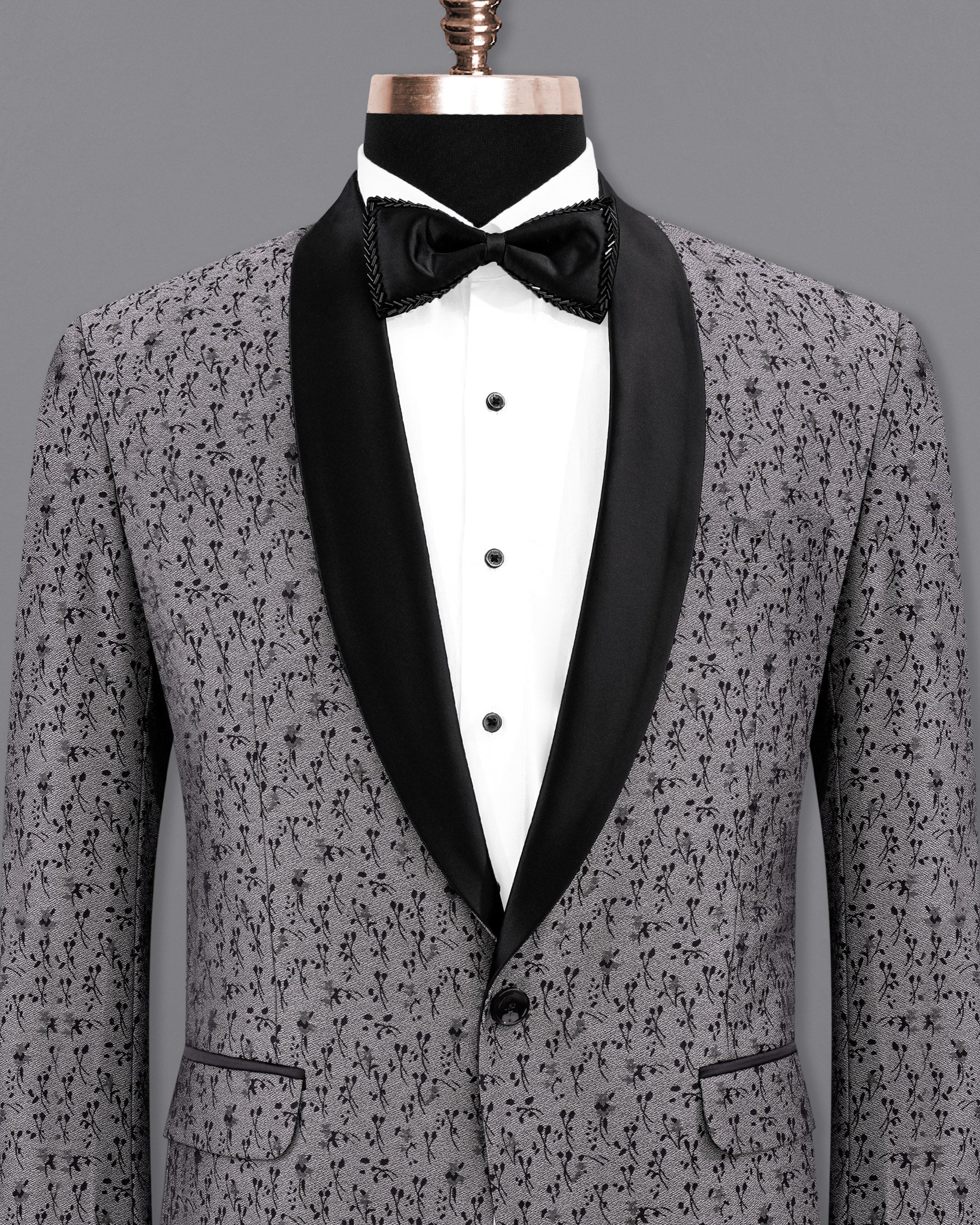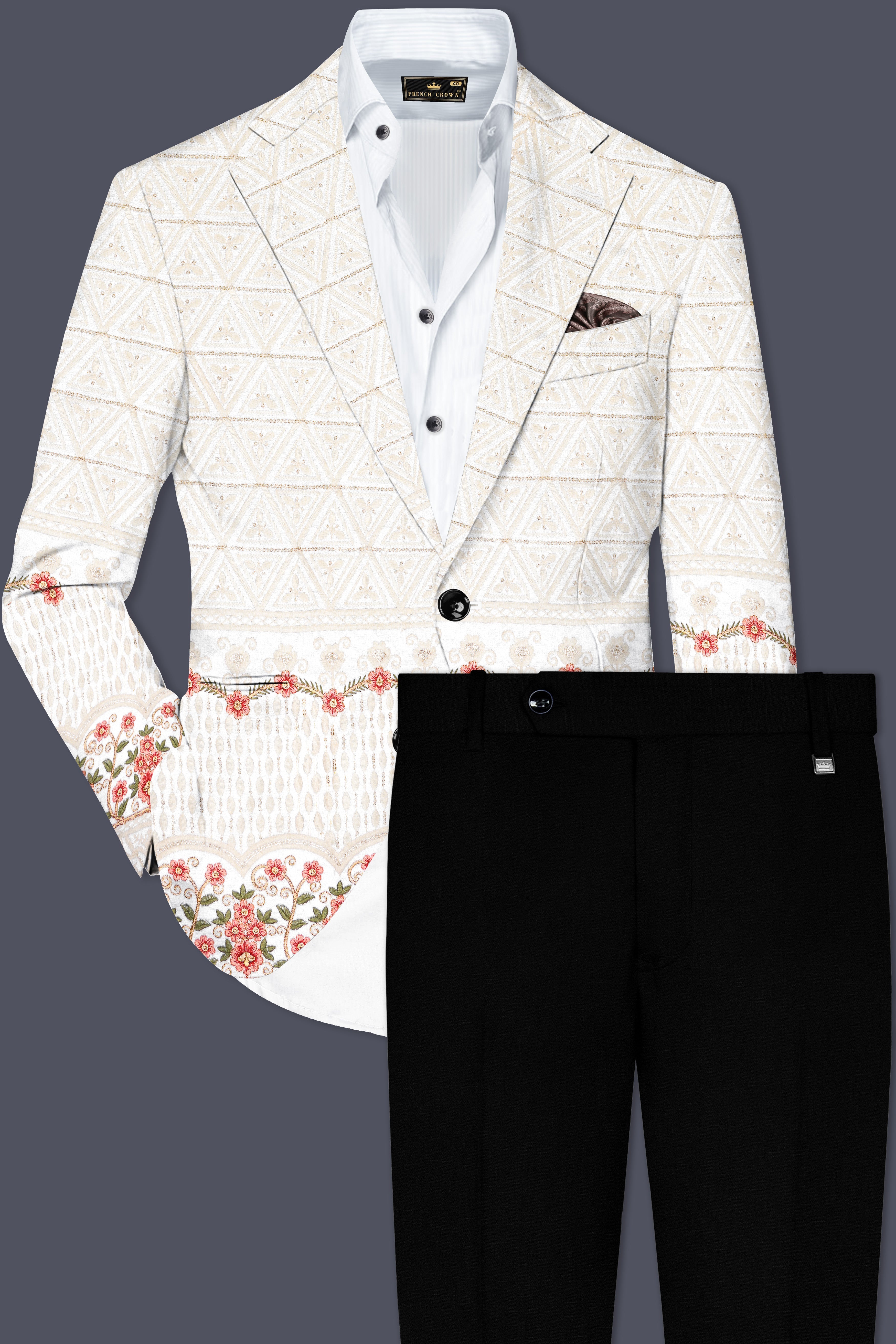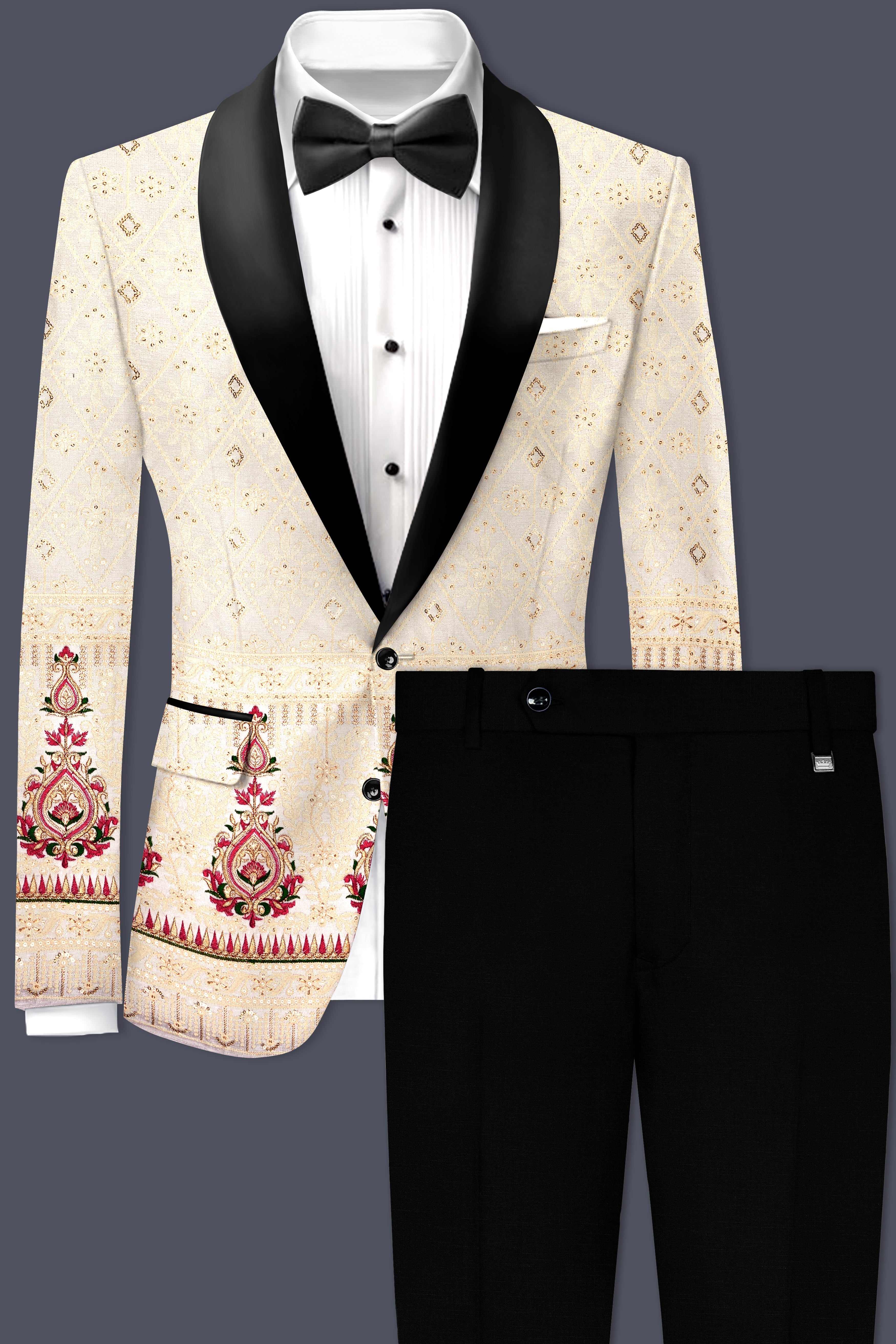 Off White And Sunset Pink Flower Multicolor Sequin and thread Embroidered Tuxedo SuitOff White And Sunset Pink Flower Multicolor Sequin and thread Embroidered Tuxedo Suit