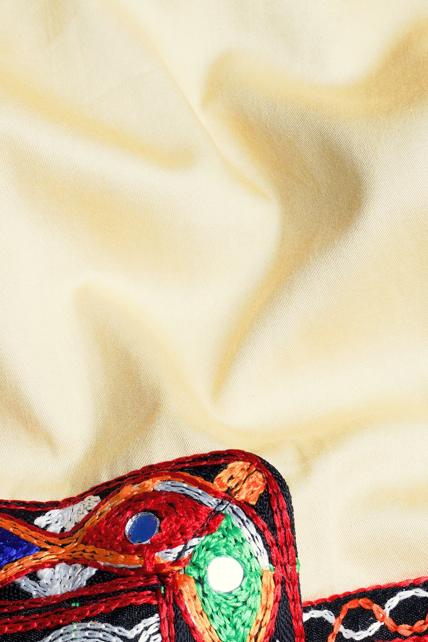 Chamois Beige Horizontal Kutch Work Patches with Mirror Work Subtle Sheen Super Soft Premium Cotton Designer KurtaChamois Beige Horizontal Kutch Work Patches with Mirror Work Subtle Sheen Super Soft Premium Cotton Designer Kurta