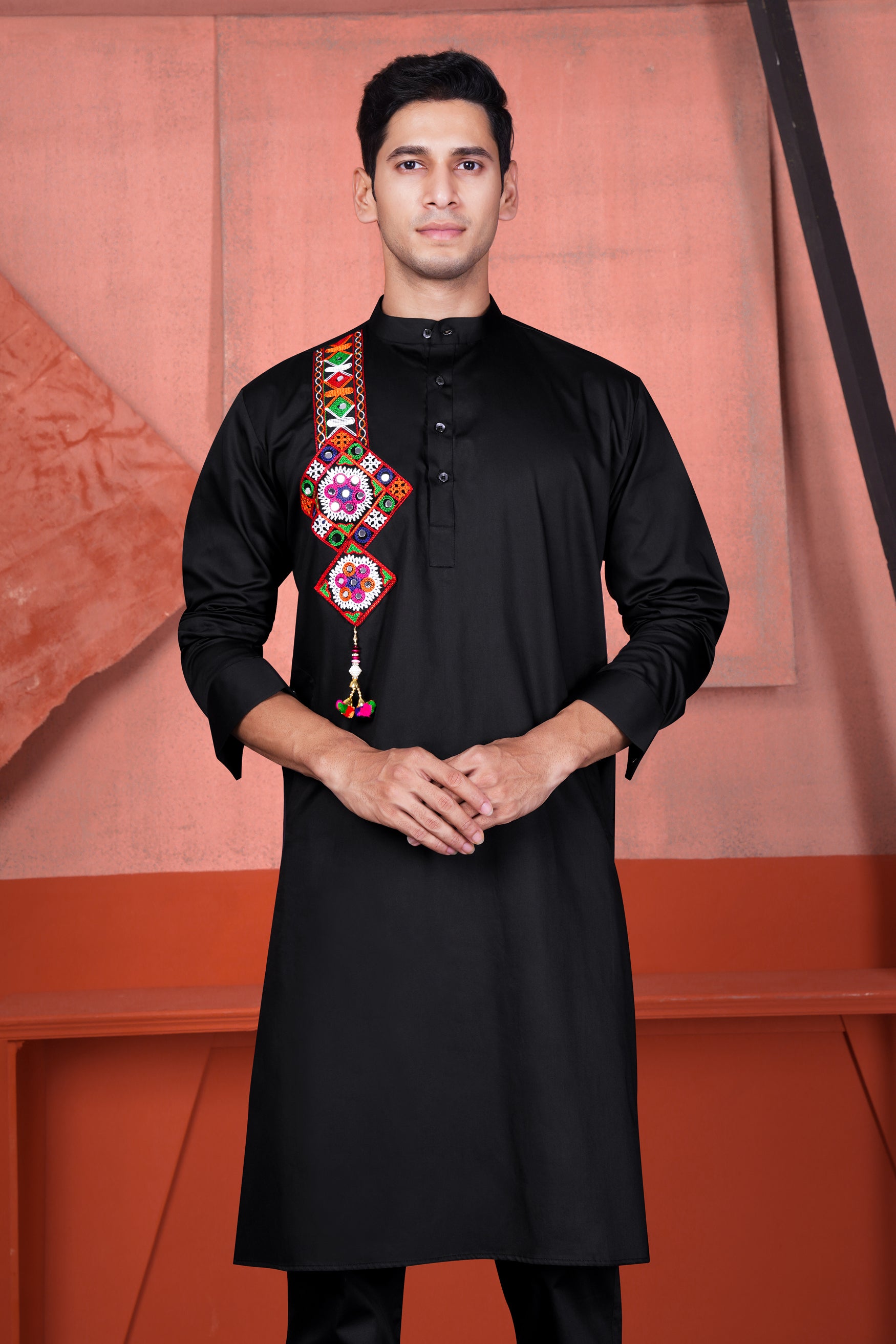 Jade Black Multicolour Kutch Work Patches with Mirror Work Subtle Sheen Super Soft Premium Cotton Designer Kurta Set