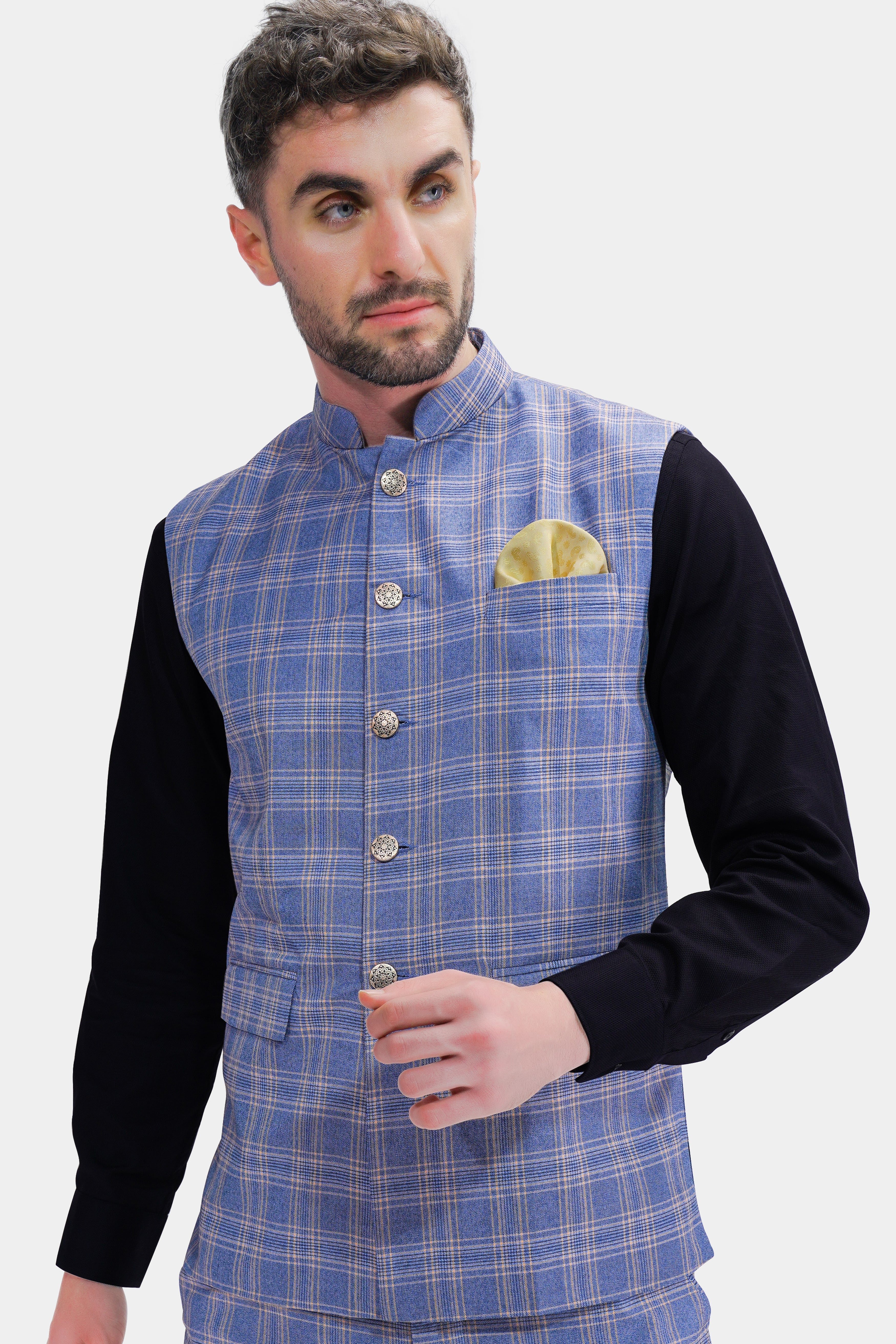 Scampi Blue and Muesli Brown Plaid Wool Rich Nehru JacketScampi Blue and Muesli Brown Plaid Wool Rich Nehru Jacket