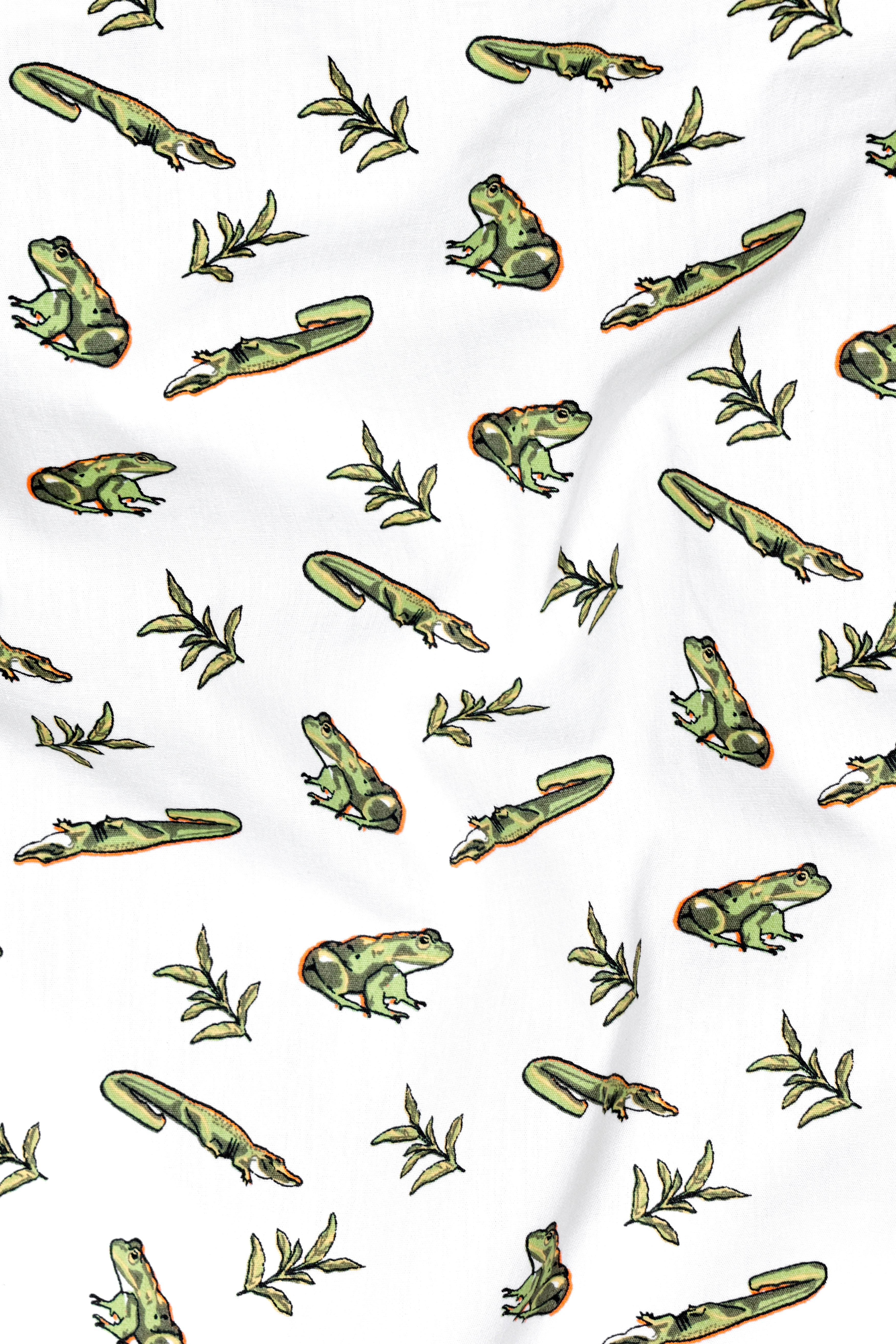 Bright White with Sage Green Frogs and Crocodiles Printed Poplin Cotton Shirt