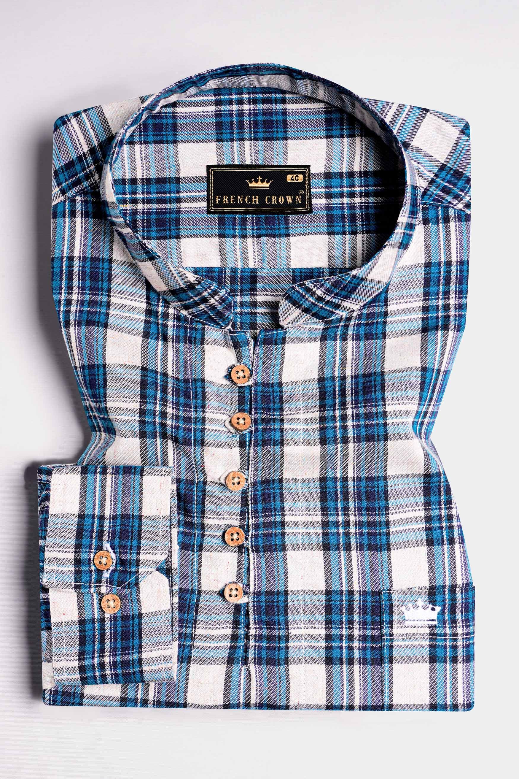 Bright White and Black Checked Royal Oxford Kurta ShirtBright White and Black Checked Royal Oxford Kurta Shirt
