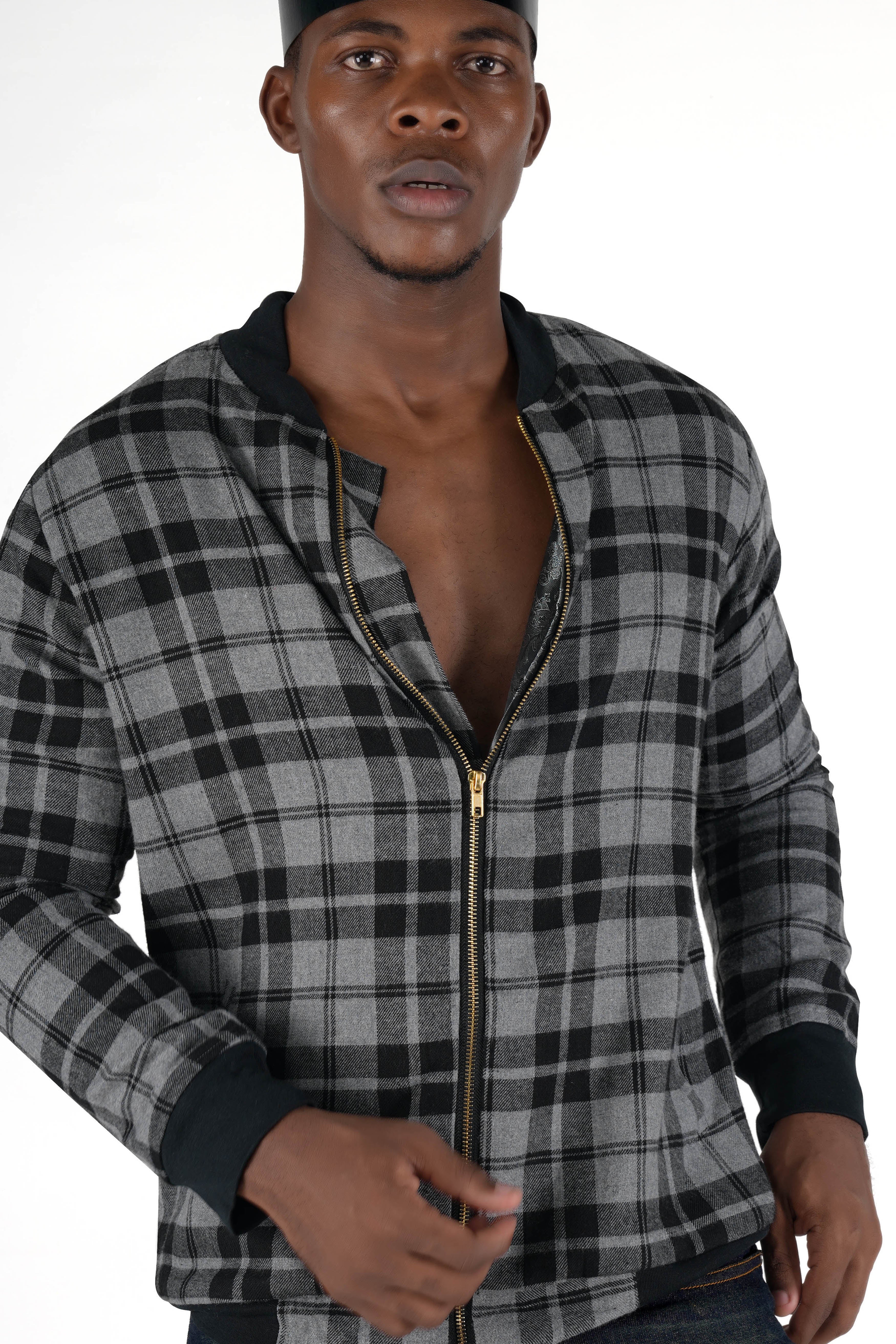 Vensu Gray with Tealish Black Checkered Flannel Bomber Jacket