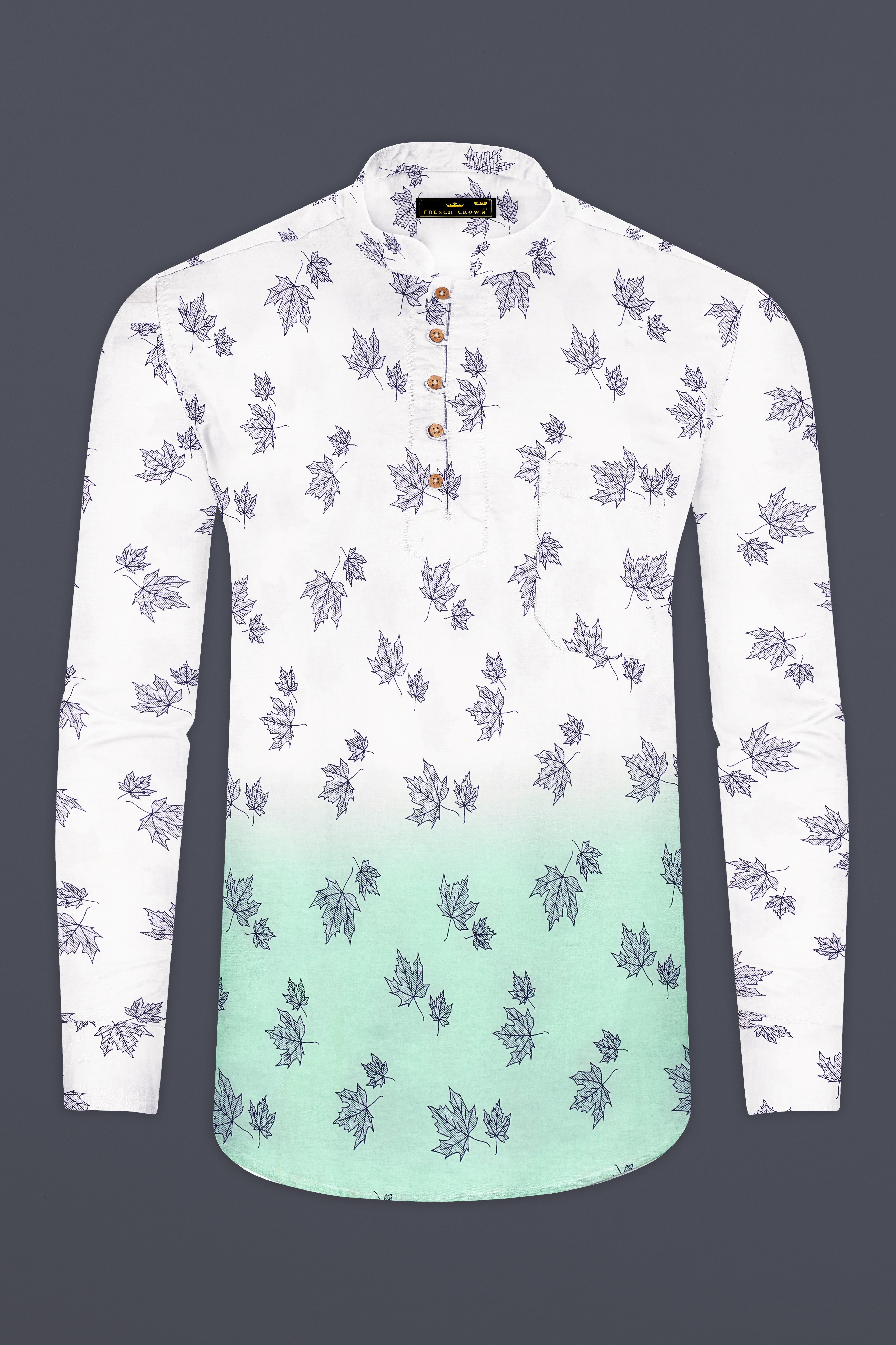 Bright White with Cruise Aqua Green Leaves Printed Premium Cotton Kurta ShirtBright White with Cruise Aqua Green Leaves Printed Premium Cotton Kurta Shirt