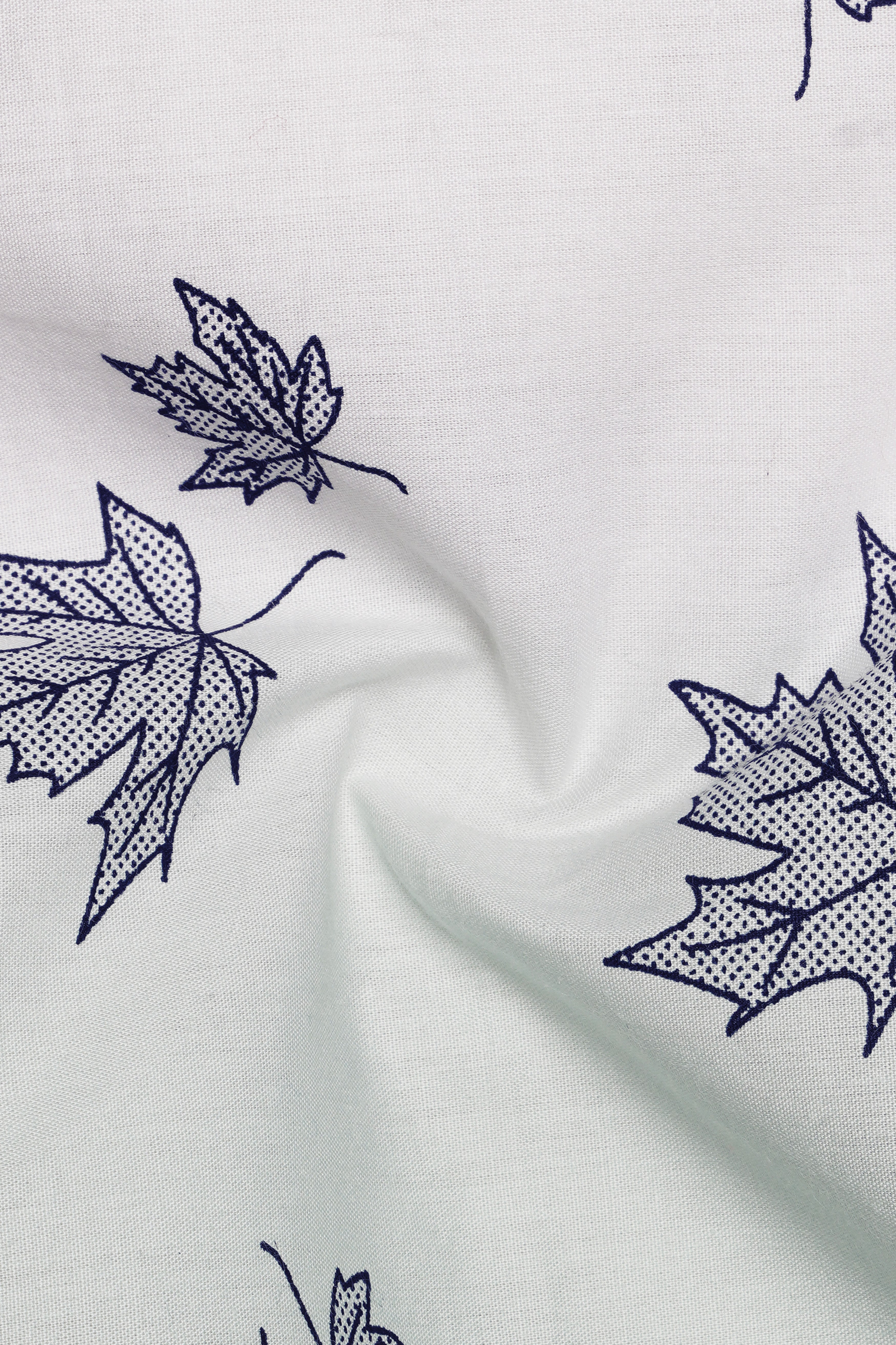 Bright White with Cruise Aqua Green Leaves Printed Premium Cotton Kurta Shirt