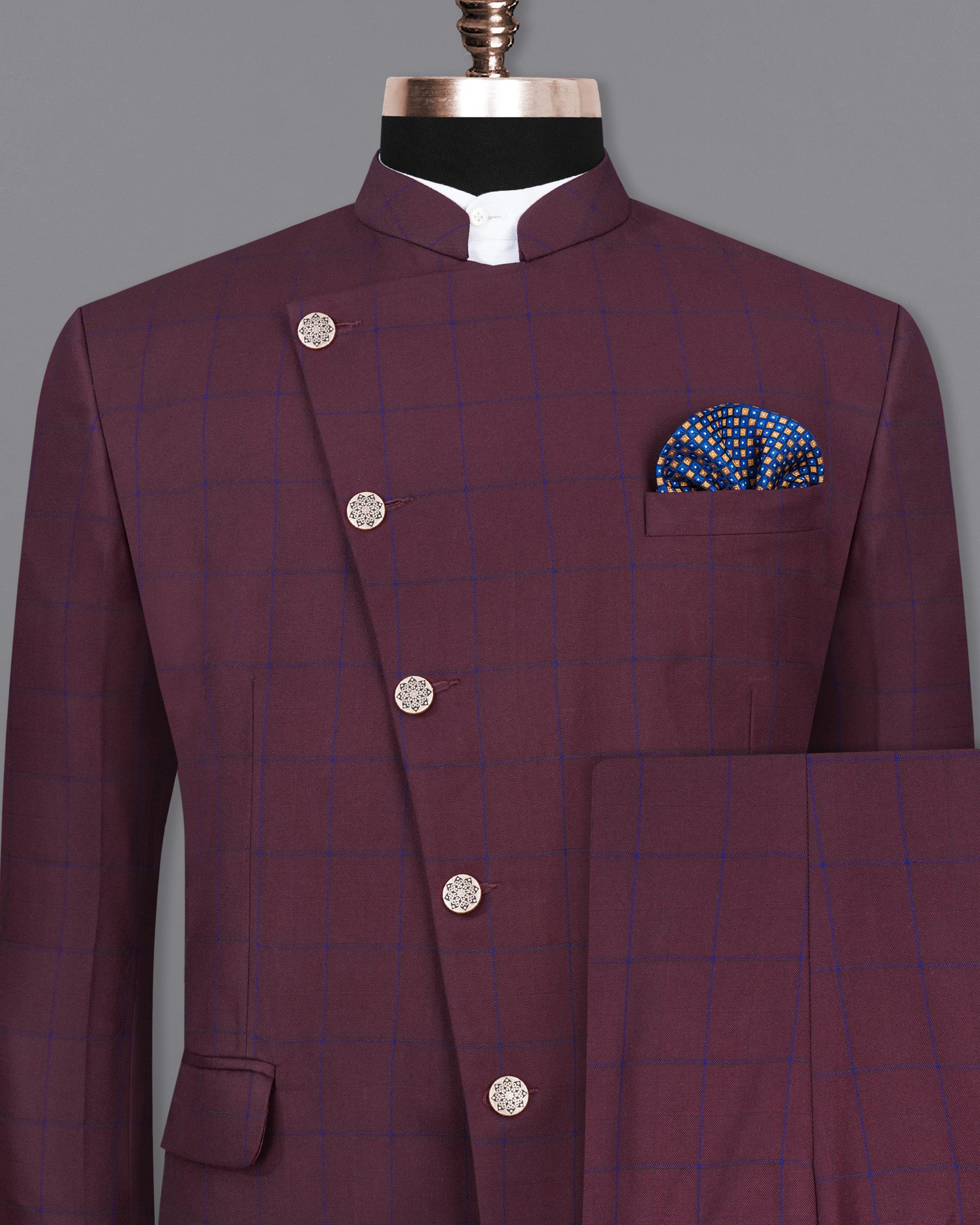 Wine Berry With Haiti Blue Windowpane Cross Placket Bandhgala SuitWine Berry With Haiti Blue Windowpane Cross Placket Bandhgala Suit